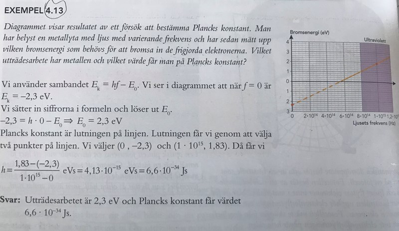 Hej, jag behöver hjälp med att förstå dels varför man tittar på när f=0 för att lösa ut utträdesarbetet men också varför lutningen på linjen är plancks konstant?