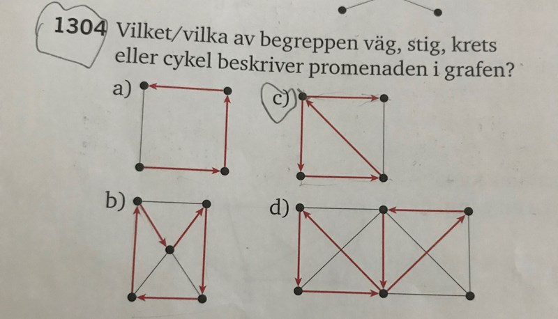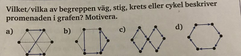 På c) så uteslutar jag krets och cykel på en gång. Kvar blir väg och stig. Jag får det att det är både väg och Stig eftersom att promenaden inte är sluten samt så passerar den inte samma kant/hörn mer än en gång. Facit säger att det är en väg och jag förstår inte varför.