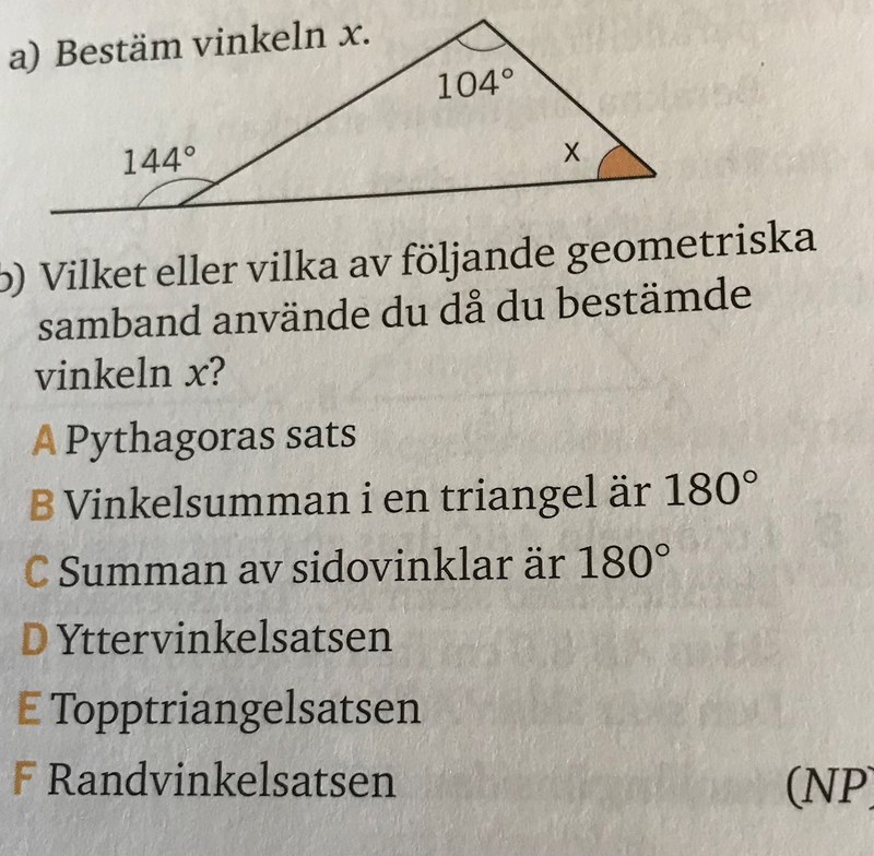 Jag löste a och fick fram att x var 40. Jag vet att en rak vinkel är 180 grader så jag subtrahera med 144 och fick fram svaret 36, 36 är sidan av den ena triangeln så jag adderade 36 med 140. Därefter vet jag att arean av en triangel är 180 grader så jag subtrahera därefter 180 med 140 och fick fram det till 40. Men vet inte vilken typ av samband jag har använt, själv kände jag för att använda lite logik men jag behöver ju också kunna beräkna det matematiskt. Skulle någon kunna hjälpa mig att ta reda på vilket samband jag använt?