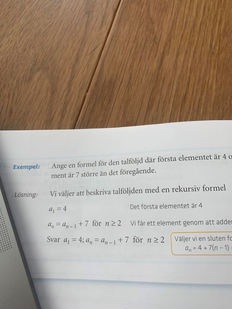 Om du hade valt att sätta a0 = 4 och an = an-1+7 så hade det gått lika bra, men då hade den första termen hetat a0, inte a1. Smaksak. Mina programmeringsstuderande barn hade definitivt gjort så. De tycker det är naturligt att börja räkna på 0. Jag håller inte med dem.