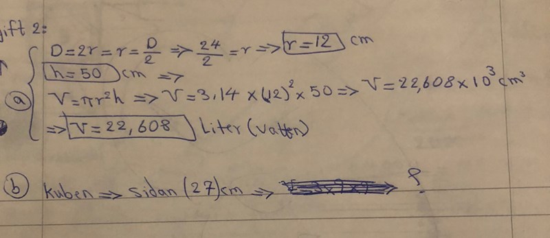Du har en cylinder fylld med vatten. Cylindern är en halv meter hög och har diametern 24 cm. Nu vill du hälla över vattnet i en kub med sidan 27 cm.