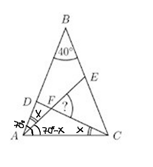 Med första lösningsförslaget är vinkeln med ? yttervinkel till triangeln med vinklar x (ACD) och 70-x (CAE).