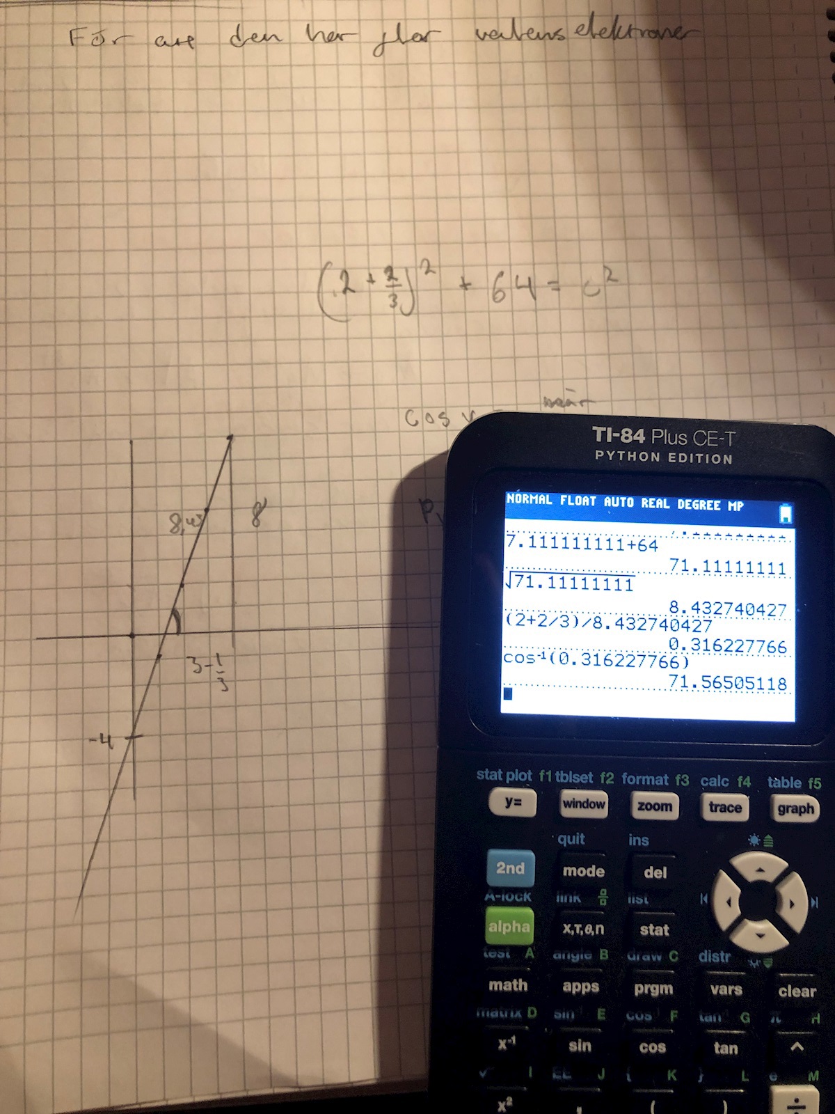 Cos v är ju närstående/hypotenusan så jag satte in (2+2/3)/8,43 och tog sedan arccos på svaret. Det blev ungefär 72º. Låter det rimligt?