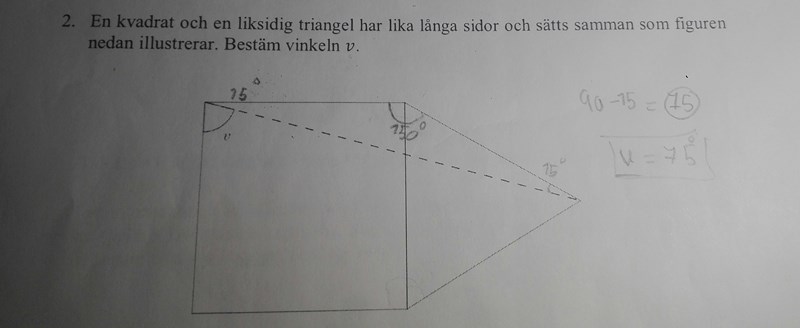 Då ser man att man kan få v genom att subtrahera den vinkeln som triangeln och kvadraten delar med varandra alltså 90 -15= 75 grader