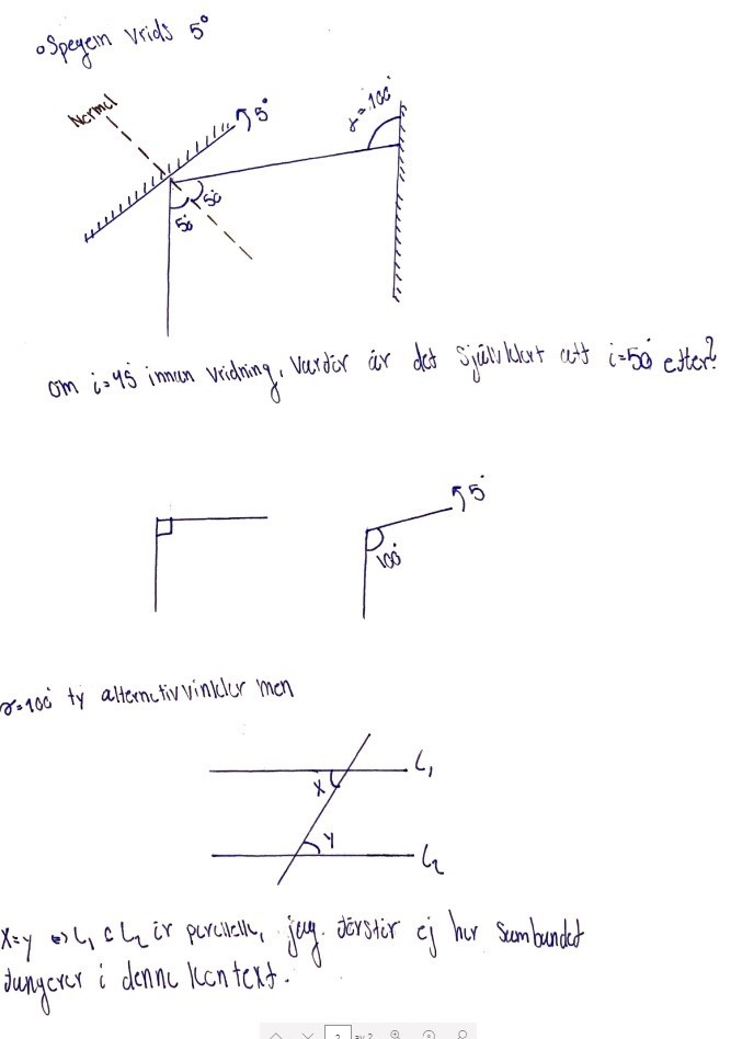 Dock förstår jag inte varför det är självklart att i = 50 grader respektive 40 grader om spegeln vrids framåt eller bakåt 5 grader.