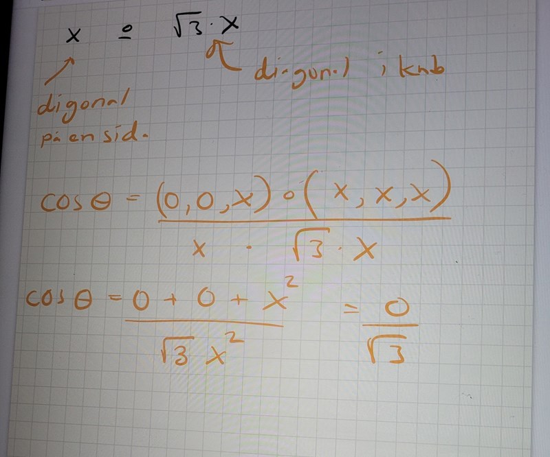 Macilaci skrev:Du vill beräkna vinkeln mellan två vektorer, a = [1,1,0] och b = [1,1,1] (vi kan låta x vara 1).
