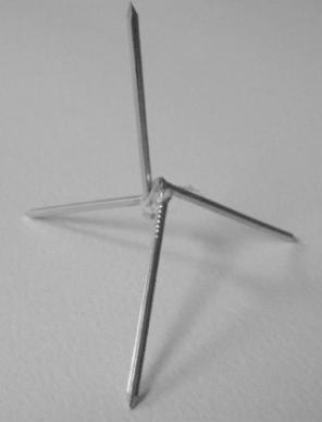 Så här står det i facit: Man kan också placera spetsarna i triangel i xy-planet, och så se på vilken höjd centrum ska sitta för att vinkeln mellan den lodräta spiken och en av de andra ska bli samma som den mellan två av de andra.