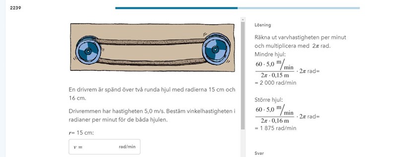 Man delar inte med antalet radianer, man delar med omkretsen för hjulet. Då får man fram hur många varv hjulet snurrar på 1 minut. Sedan multiplicerar man med antalet radianer per varv, d v s .