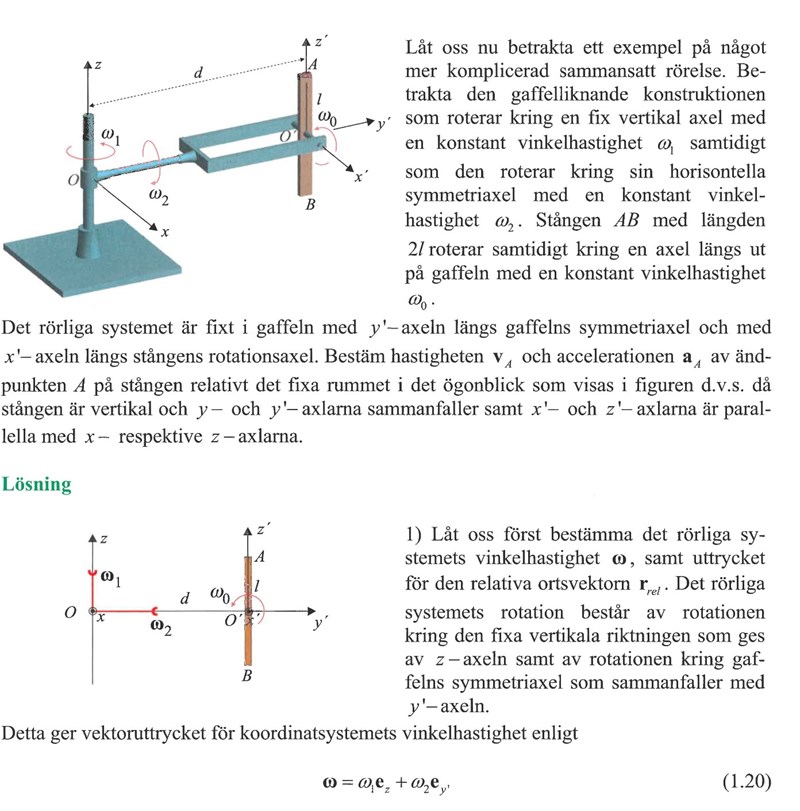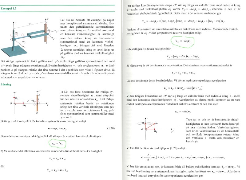 Tänk att du sitter i det rörliga(primmade) systemet och följer med i dess rörelse. Relativ dig och det rörliga systemet så rotar stången som en propeller kring x’-axeln. Stångens ände A rör sig med vinkelhastigheten omega_noll på en cirkel med radie l relativt det primmade systemet. Den relativa hastigheten är därför l•omega_noll i negativa y’-riktningen.