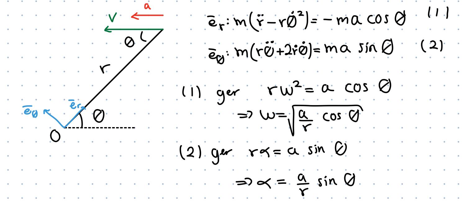 Vilket är vinkelhastigheten man söker. Sammanställer du istället i -led får du ett samband för . Det kan du använda när du bestämmer accelerationen. Använd samma teknik (dvs projicera på axlarna och jämför med andraderivatan av lägesvektorn vilket är samma sak som de uttryck du fått fram för accelerationen i ditt eget lösningsförslag)
