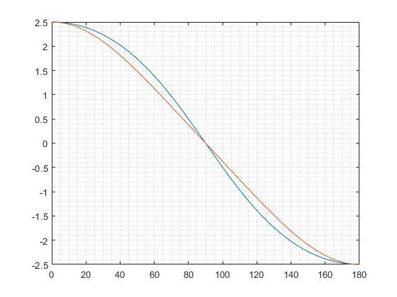 Jag har testat att ta bort x komposanten i så att där tanken är att det bara är y-komposanten som ger upphov till en vinkelhastighet vid . Jag har nu jämfört graferna och får följande: