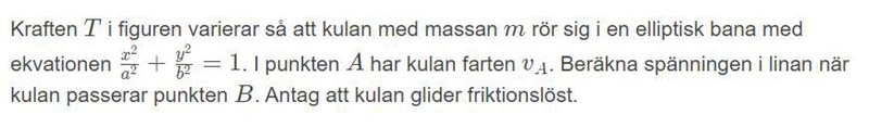 Min lösningsidé: Derivera uttrycket för banan med avseende på "t" för att få hastigheterna i x respektive y led. Använd formeln: , varefter stoppa in i för att ta reda på F i repet. Detta är en skissartad idé till lösningsmetod som jag har.