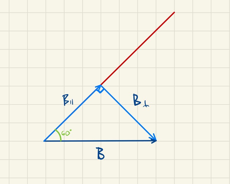 Det sneda strecket är ledningen med ström. Vi kan dela upp B i en komposant parallell med ledaren och en komposant vinkelrät mot ledaren - se figur. Med trigg kan du räkna ut storleken på komposanterna.