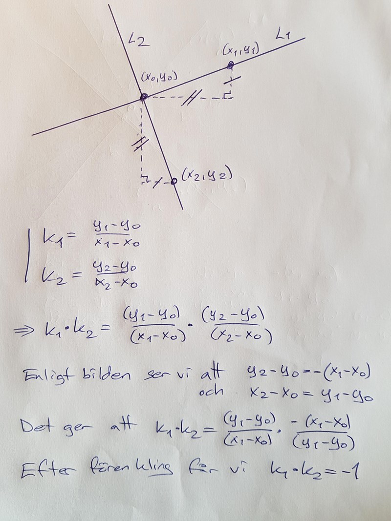 Om två vektorer är vinkelräta så är produkten av deras riktningskoefficienter lika med -1-1, dvs om p¯\bar{p} och q¯\bar{q} är vinkelräta så är kp·kq=-1k_p\cdot k_q=-1.