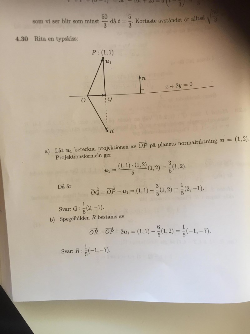 Uppgift a) Hur vet man att origo ligger på linjen? Om origo ligger utanför blir ju den resulterande vektorn (OP-projektionen) inte ortogonal mot P? Om den ligger på linjen beror storleken av projektionen vart på linjen origo befinner sig? Men den resulterande vektor blir ortogonal mot P.