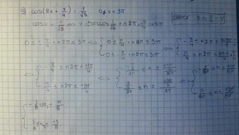 Jag försökte lösa den. Så det blir cos (2x+pi/4)= Sätter 2x+pi/4=v (1)