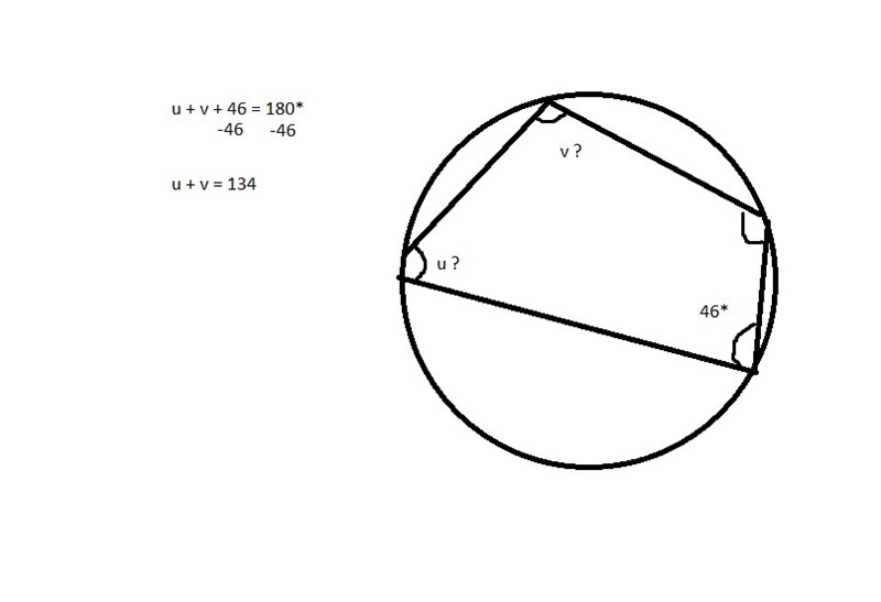 Om vi kallar den fjärde vinkeln för w så gäller det att v + 46° = 180° samt att u + w = 180°