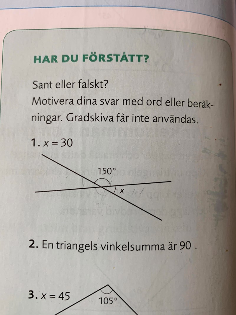 Jag försöker besvara fråga 1 i denna uppgift. Mitt svar var att det är sant, dvs X = 30 grader. Min motivering till det var att vinkelns x sidvinkel i sådana fall också måste vara 30 grader. Om fallet är så, då blir det 150 grader + 30 grader vilket blir 180, dvs ett halvt varv. Men enligt facit stämmer inte påståendet, varför det?