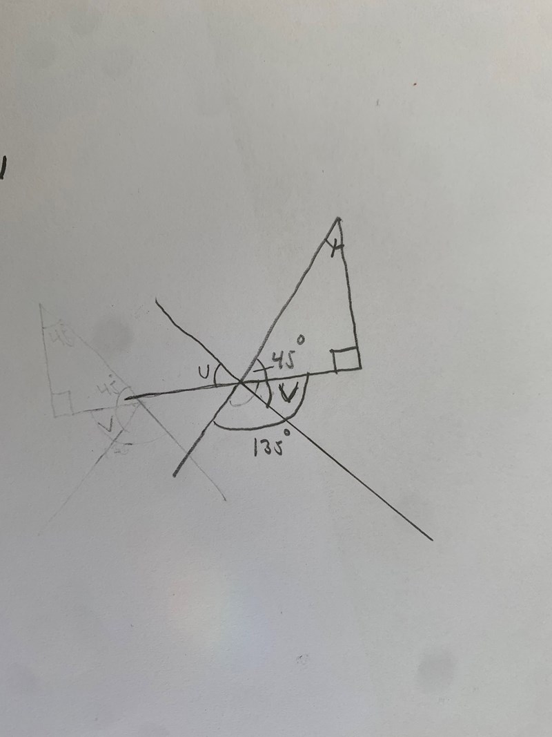 Hej jag försöker räkna ut vad vinkeln V är. Har använt yttervinkelsatsen för att ta reda på att de nedre vinklarna tillsammans är 135° men vet inte hur jag ska gå till väga för att få reda på vad vinkel V är.