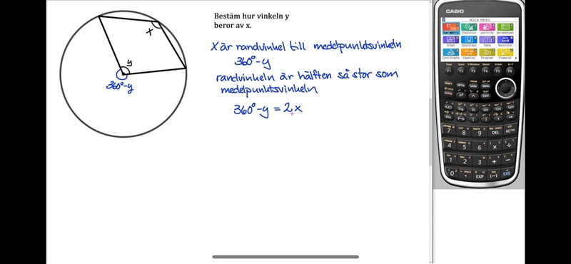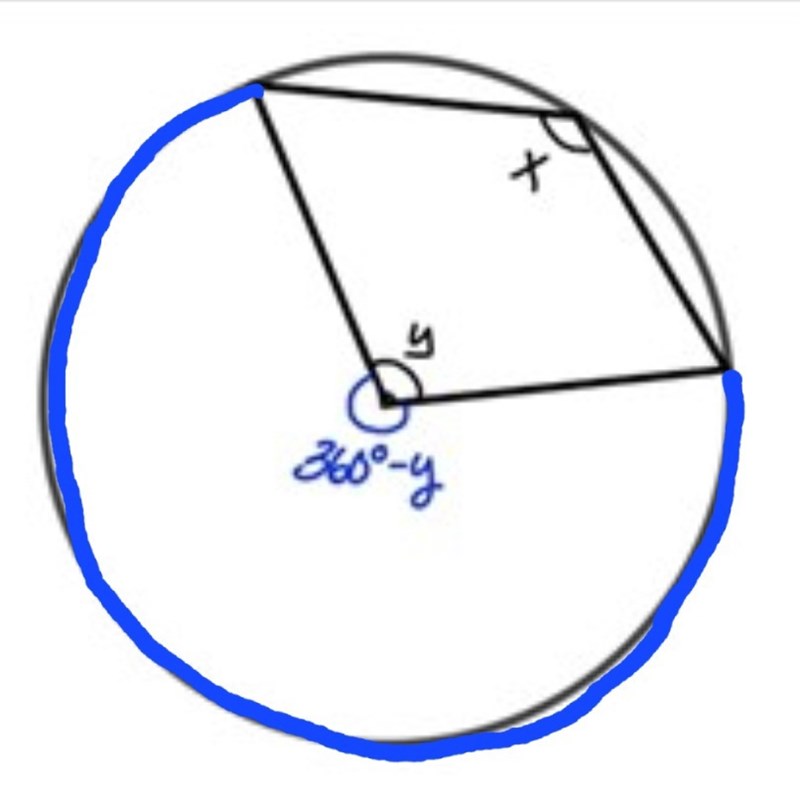 Hej! Hur kan x vara randvinkeln till medelpunktsvinkeln 360-y, var är punkterna som blir rendvinkeln? Jag fattar inte..