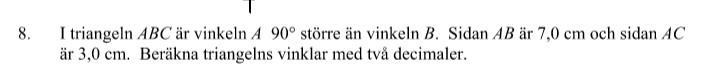 Jag kallade vinkel B för x då blir vinkeln A x+90 och vinkeln C blir då 90-2x. Jag har ritat bilden då kan jag använda sambandet . När jag löser det blir det fel.