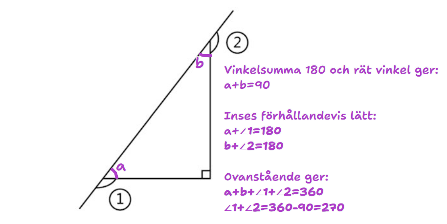 Tycker eleverna inte om att räkna så mycket kan man tänka sig att man sätter gångjärn vid den räta vinkeln och fäller upp den vågräta kateten mot den lodräta. Den nedre vinkeln kommer då att bli fortsättningen på den övre och strålen från (1) kommer bli vinkelrät "mot sig själv" och därmed ge upphov till en rät vinkel vid (2) och därmed är vinkeln 360-90=270. Det kräver lite spatialt tänkande men med en tumstock kan man förevisa det. När jag gick i skolan hade läraren alla typer av överdimensionerade ritverktyg m.m. för demo. Det var på "passarnas tid". Mycket har ändrats, men det gav en bra insikt i lite "praktisk matematik/geometri".