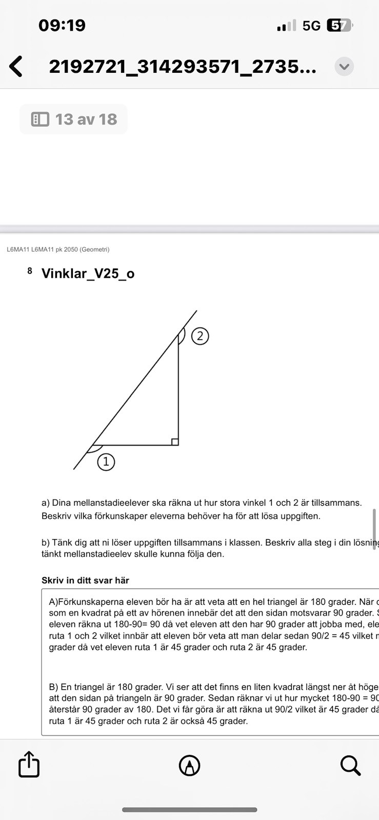 Jag vet inte riktigt hur jag ska lösa den uppgiften. Jag har själv försökt men vet inte riktigt ifall det är rätt. Jag tänkte att vinkelsumman hos en triangel är 180 grader och ifall subtraherar 180-90 då får jag 90, så vi klarna som är inne i triangeln måste vara 90 tillsammans och då har jag två raka vinklar som är 180 som jag subtraherar med 90 då får jag 135 grader. Då tänkte jag att vinkel 1 är 135 grader och vinkel 2 är 135 grader. Men jag känner att det är fel svar