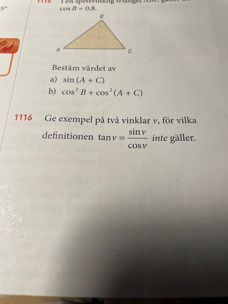 Jag har en uppgift där man ska ge exempel på två vinklar v, för vilka definitionen tan v=sin v/cos v inte gäller.