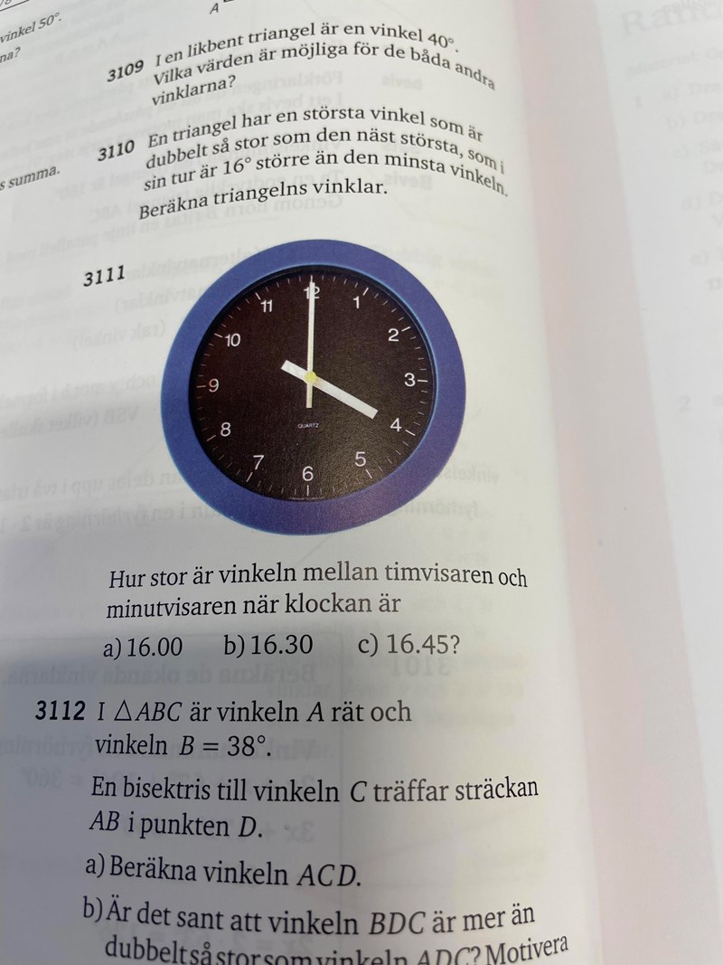 Ture skrev:Rita en bild av klocken och hur visarna står 16.45 och vilken vinkel som söks.