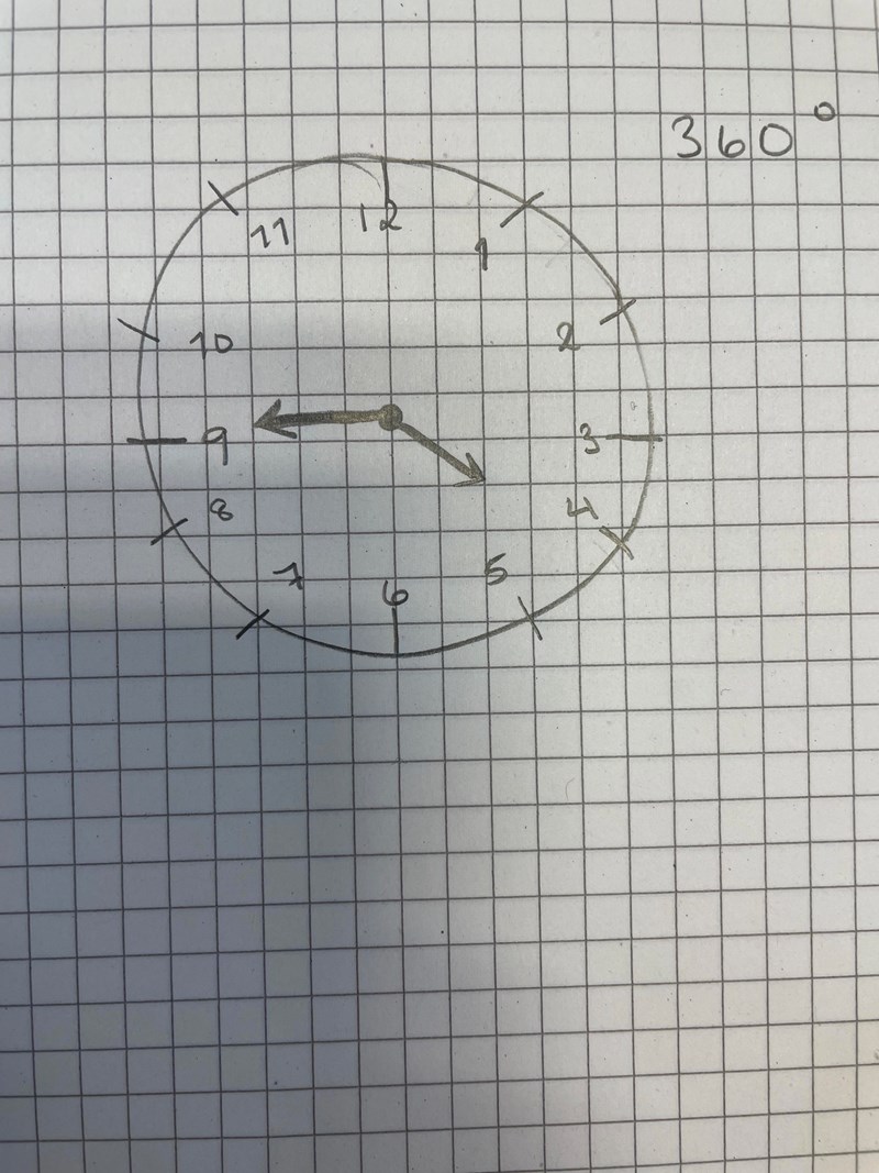 Jag tänker nog helt fel.. men om vi säger att timvisaren istället hade stått på 5 och minutvisaren på 9 hade vinkel varit 120 grader eller hur?
