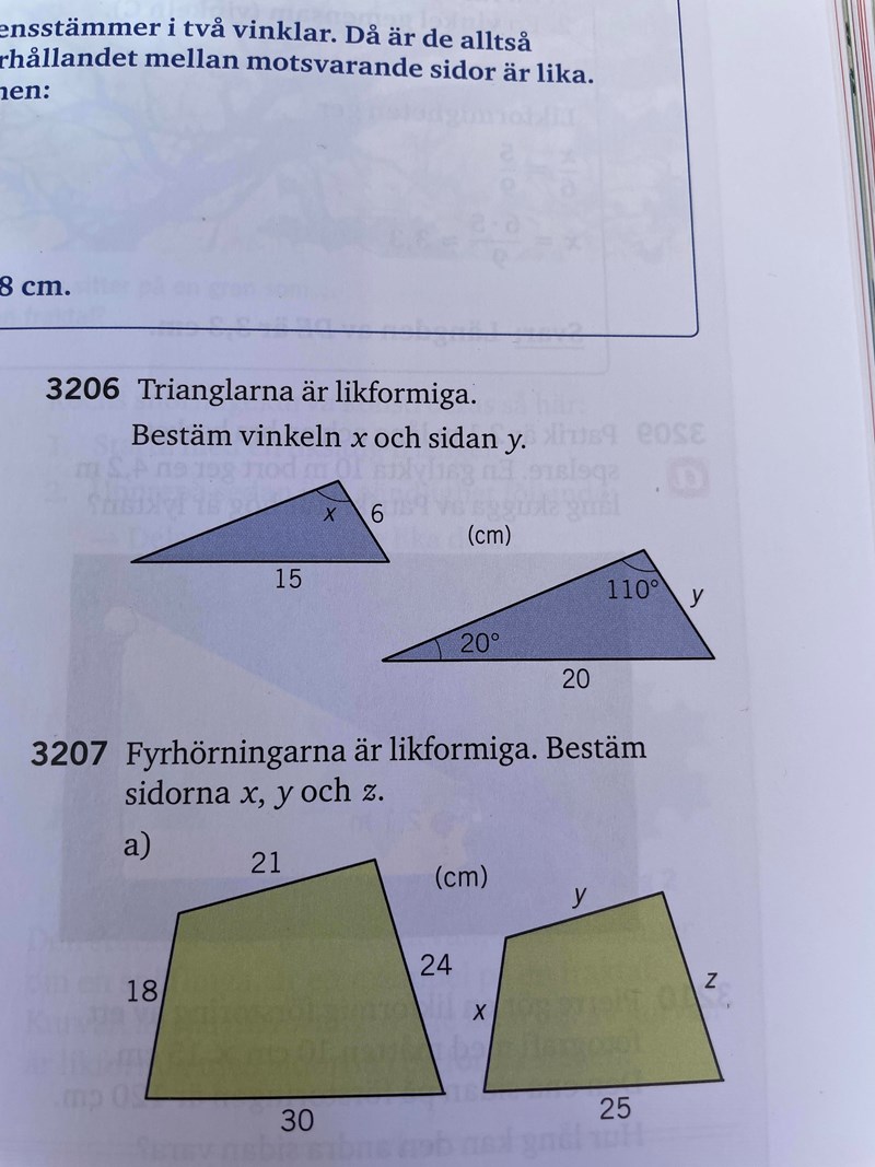 Skulle någon kunna förklara för mig hur vinkel x kan vara 110 grader. Har räknat ut att y = 8cm. Då tog jag y/6 = 20/15.