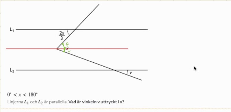 Dra en tredje linje, parallell med de två andra, genom ”spetsen” med vinkeln x. Linjen delar vinkeln x i två delvinklar vilkas storlek man lätt kan inse.