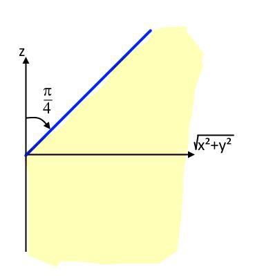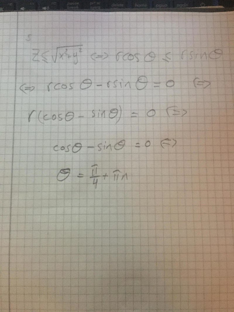 Alltså är zx2+y2rcos(θ)rsin(θ)z\leq \sqrt{x^2+y^2} \iff r\cos(\theta)\leq r\sin(\theta)