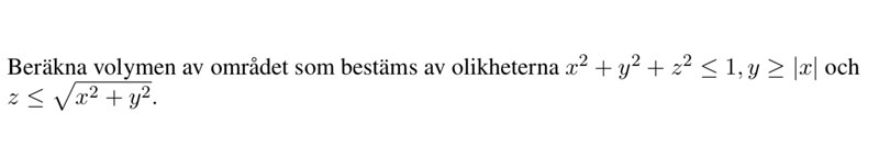 Beräkna volymen av området som bestäms av olikheterna x2 + y2 + z2 ≤ 1, y ≥ |x| och z ≤sqrt(x2 + y2).