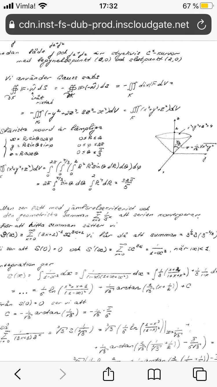 hej, igen i ett annat fråga får jag detta området, x^2+y^2+z^2=4, 3z^2=x^2+y^2, z>=0. så jag vet från klotet att radien är 2.  och när vi byter till sfäriska koordinater får vi att vinkelen 0<φ<2pi. och att 0<θ<pi/3. men när jag använder att z=0 och att z=Rcosθ och lösar att cosθ=0, men får att θ=pi/2, så det är inte rätt, och även då jag använder att z=1/sqrt(3)*sqrt(x^2+y^2) som då ger att sqrt(x^2+y^2)=sqrt(3)*Rsinθ. och sätter att Rcosθ=sqrt(3)*Rsinθ får jag också fel, kan jag få hjälp så att jag får rätt intervall