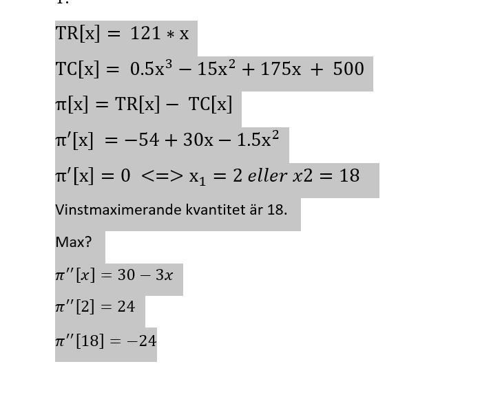 Har fastnat på en uppgift och undrar om jag är på rätt väg. Jag försöker till att börja med att räkna ut den vinstmaximerande kvantiteten.
