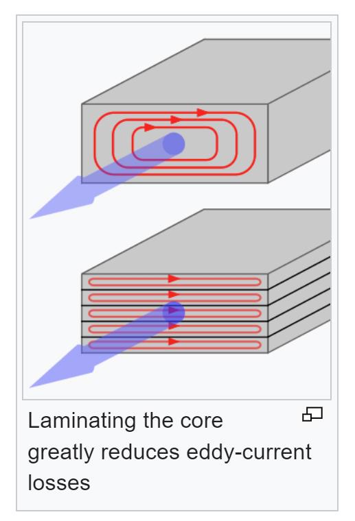 Nedanstående bild är saxad från https://en.wikipedia.org/wiki/Transformer. Den lila pilen är det magnetiska flödet, strömvirvlarna vinkelräta mot flödet. Eftersom strömvirvlarna omsluter ett mindre flöde i den nedre figuren så blir strömstyrkan i virvlarna också mindre om järnkärnan är laminerad.