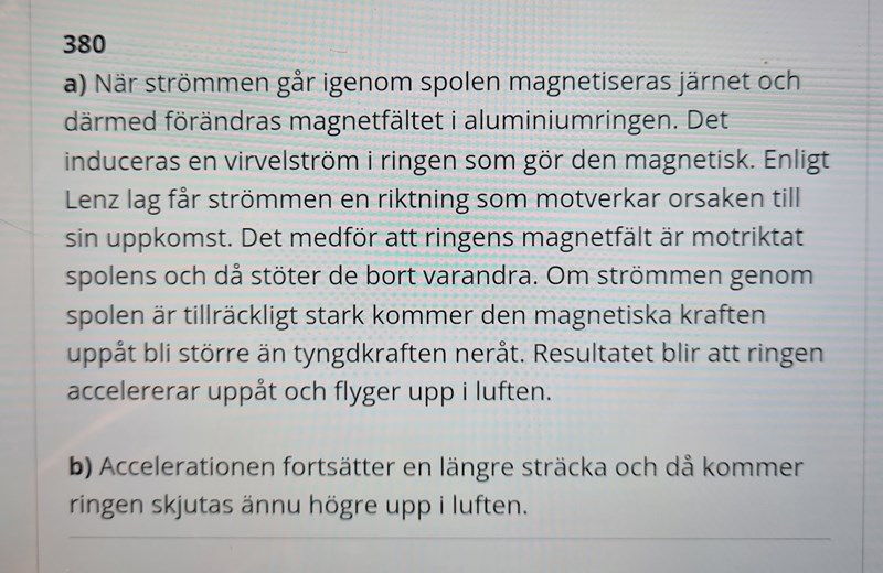 Du menar alltså att den inducerade strömmen i aluminiumringen inte är en virvelström som orsakas av det förändrade magnetiska flödet inuti ringen? (deluppgift a))