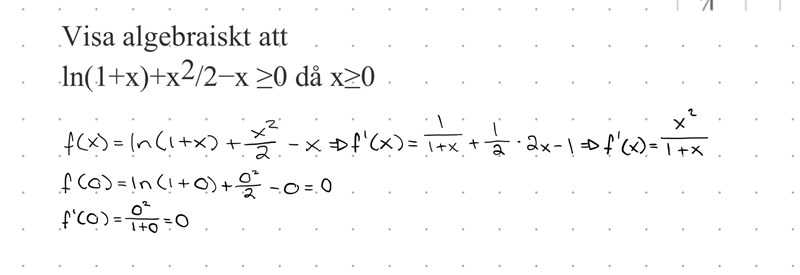 Visa algebraiskt att ln(1+x)+x2/2−x ≥0 då x≥0