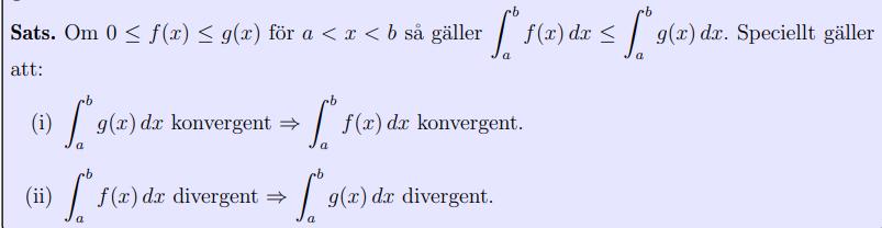 Dvs, vi har hittat en integral som är större eller lika stor som integralen vi skall beräkna konvergens eller divergens. Eftersom denna integralen nu är konvergent (väldigt enkel att integrera och beräkna) så vet vi att den mindre integralen måste också vara konvergent.