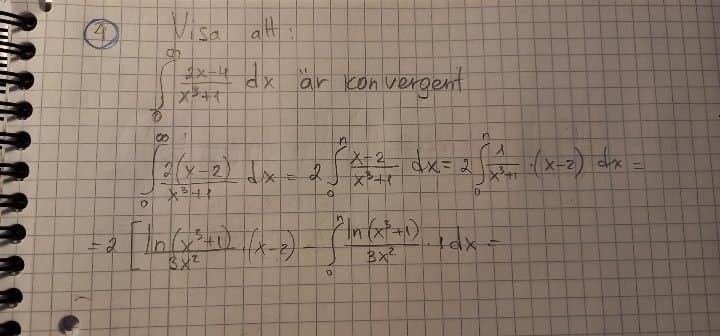 02x-4x3+102x(x+1)(x2-x+1)01x2-x+1\displaystyle \int_0 ^{\infty} \dfrac{2x-4}{x^3+1} \leq \int_0 ^{\infty} \dfrac{2x}{(x+1)(x^2-x+1)} \leq \int_0 ^{\infty} \dfrac{1}{x^2-x+1} Kommer du vidare nu?