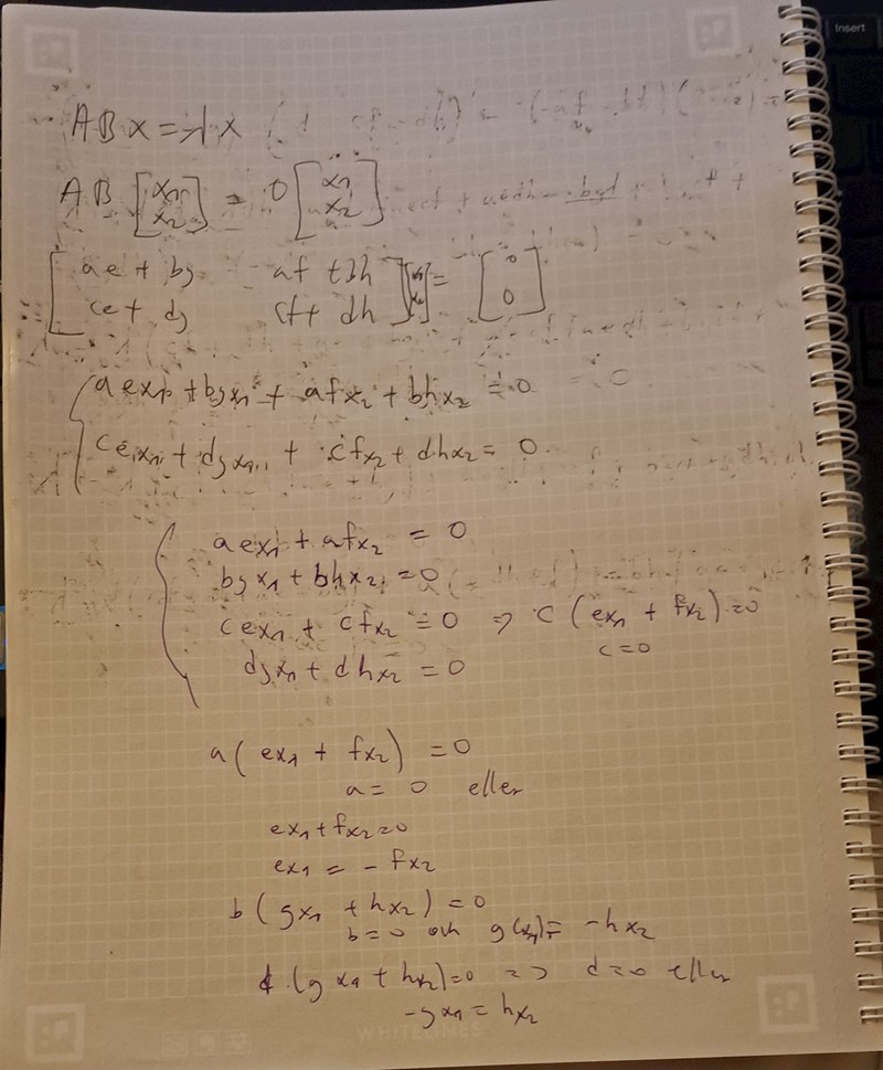 Om 0 är ett egenvärde till A så gäller att det(A)=0. Vidare har vi att det(AB)=det(A)det(B), vilket är lika med 0 eftersom att det(A)=0. Därmed är 0 även ett egenvärde till matrisen AB.