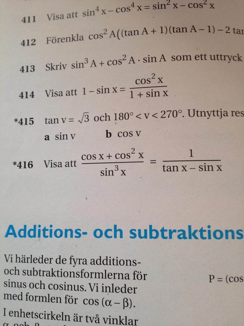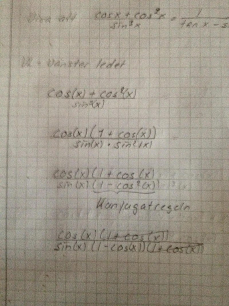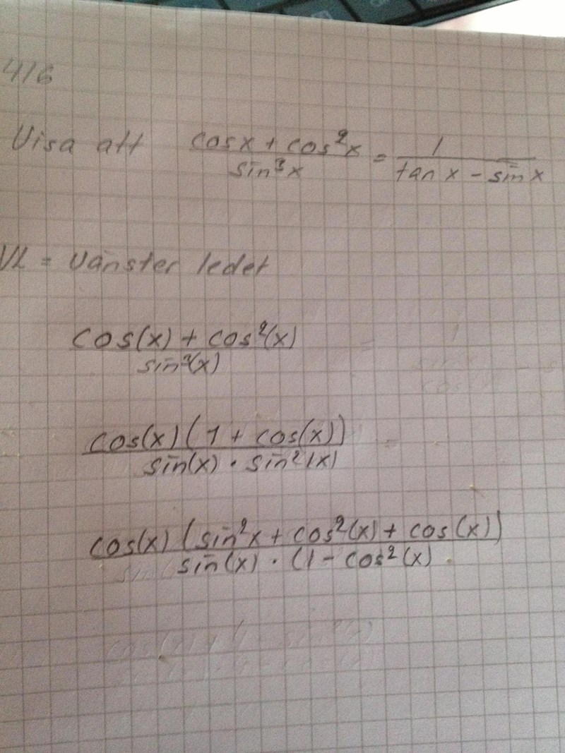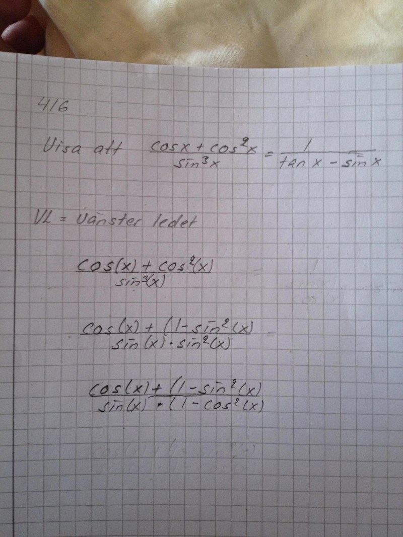 Du var på rätt väg när du var här: cos x sin x (1-cos x). Dela både täljaren och parentesen i nämnaren med cosx cos x . Skriv om parentsesen så att den består av två termer. Förkorta cos xcos x till 1. Multiplicera in sinx sin x i parentesen. Skriv om sin xcos x till tanx tan x .