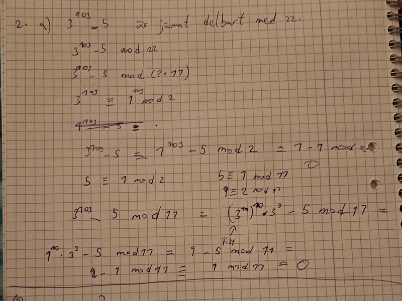 Jag provade att primtalfaktorisera 22 och se om det går att få rest 0. Dessutom insåg att Fermats lilla sats är tillämpbar här. Det verkar som att vi får rest 0 för både 2 och 11. Alltså är VL jämnt delbart med 22. Har jag tänkt rätt?