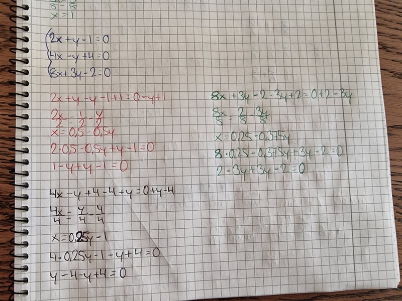 Jag antog att =0 innebar origo för alla 3 ekvationerna i ett koordinatsystem och då löste jag ut x och sedan y för vardera ekvation och då y blev 0 fick jag för mig att det innebar origo.