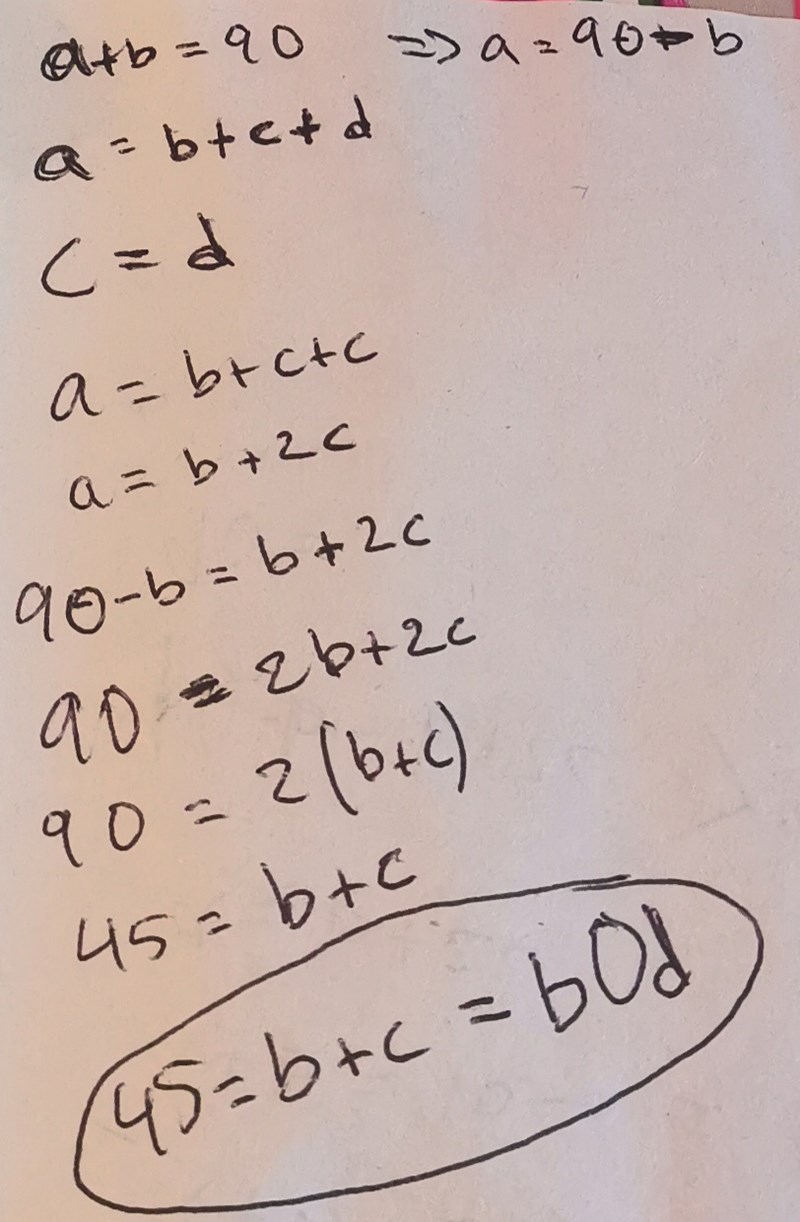 Oj, jag upptäckte att jag har skrivit fel! Andra raden skall vara a + b = 90 (inte a+c).