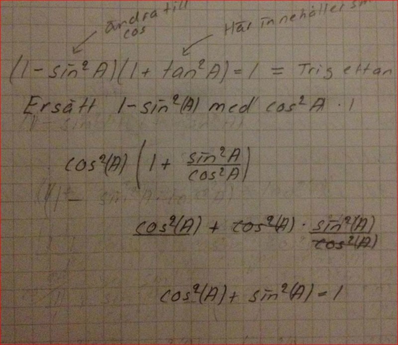 Jag rekommenderar dig att ta exempelvis tre vinklar. Säg , och , ta sedan och gå igenom alla stegen du har gjort och se om alla uttryck verkligen blir 1 för dessa vinklar, detta kan du göra med miniräknaren. Hittar du något uttryck som det inte blir 1 för?