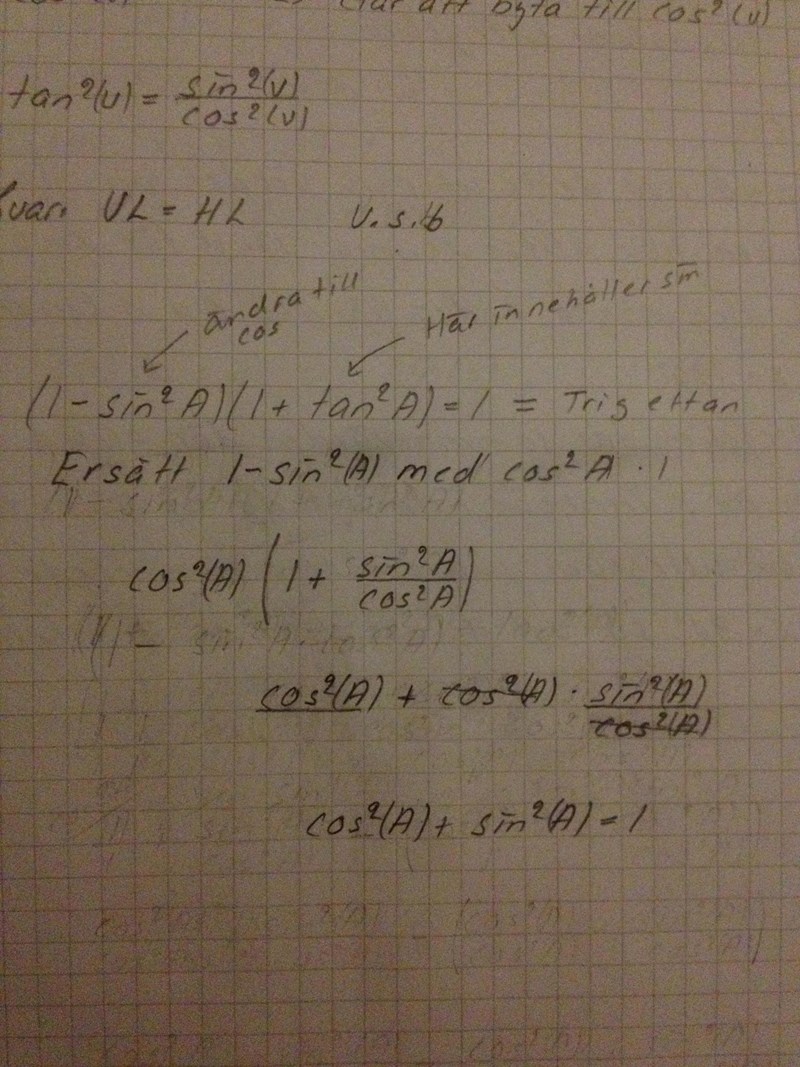 Bubo skrev :Det är skrivfel just på den raden i ursprungsinlägget. Plustecknet skall stå mellan ett separat cos^2(x) och bråket cos^2(x)*sin^2(x) / cos^2(x)