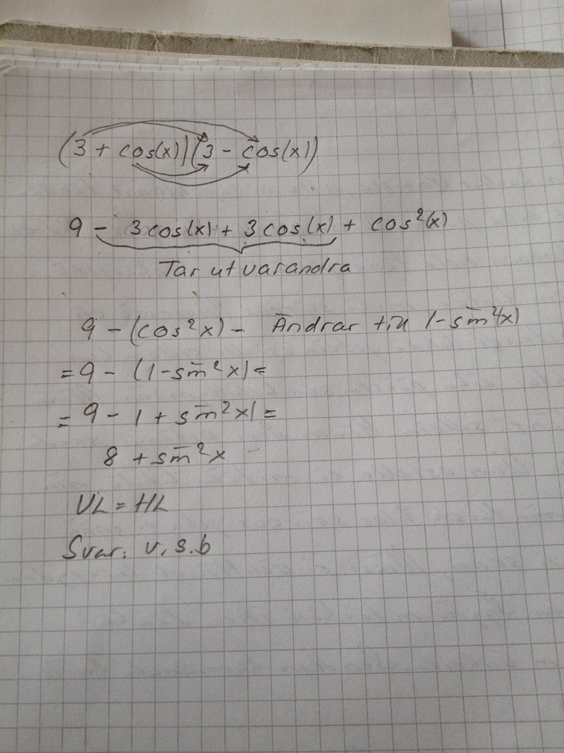 Eftersom jag vet från början, hur det ska se ut. Har jag gjort så att jag skriver vad det blir av parentesen och sedan tar cos. Man behöver bara titta på båda parentesen och har man ett minus tecken, så är det konjugat regeln som gäller. Resultatet av den och byte på cos och tänka på tecken byte inom parentesen. Då blir det färdigt resultat.