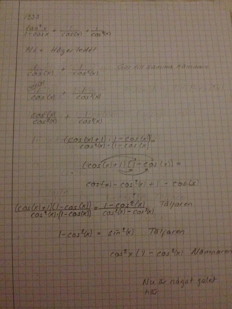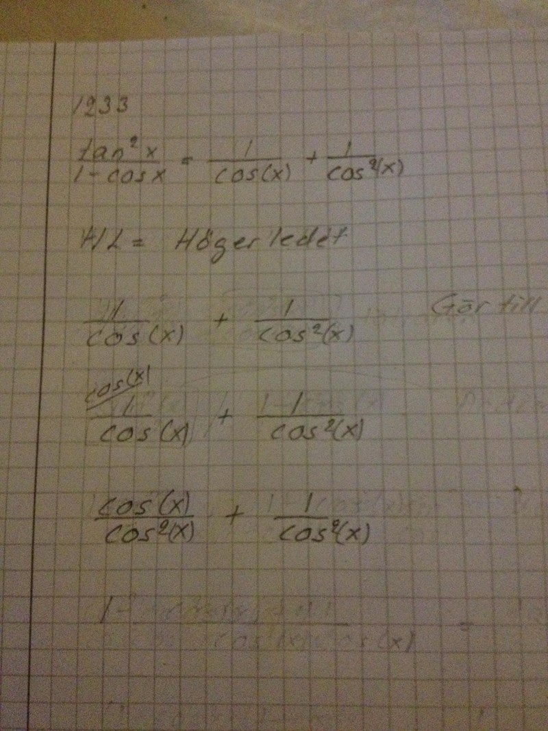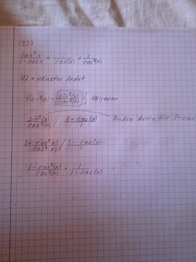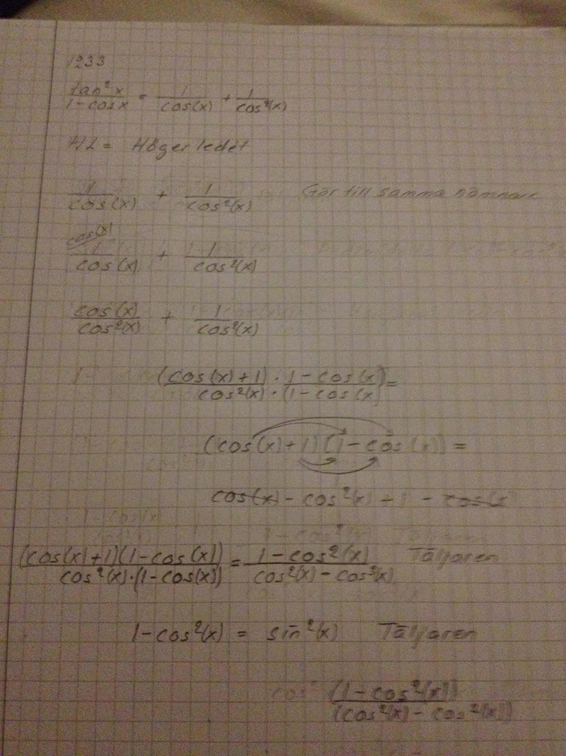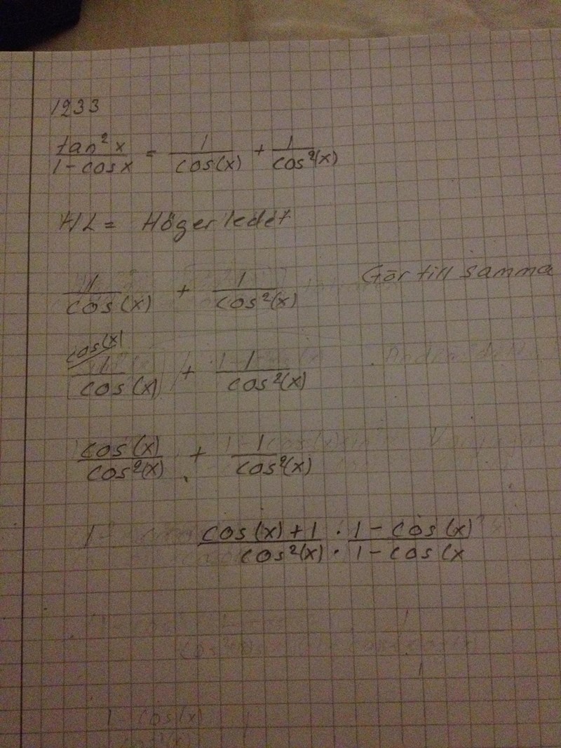 Därefter: i VL har du faktorn: 1-cosx 1-\cos x i nämnaren, förläng därför ditt bråk med den faktorn och förenkla sedan.